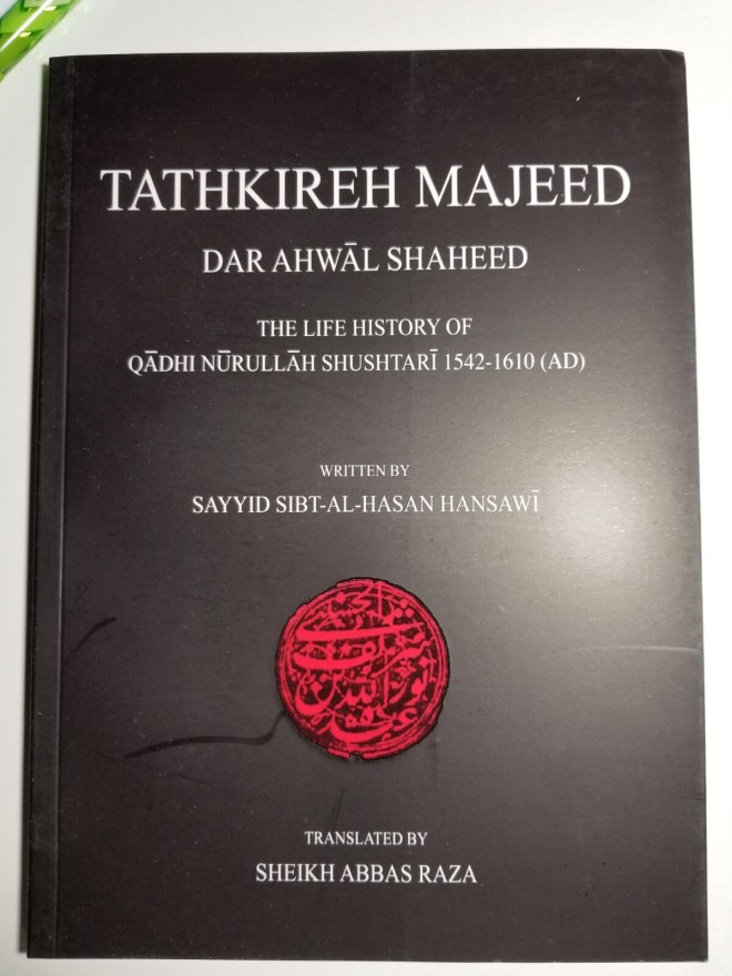 My father late Allama Saiyid Sibtul Hasan Fāzil-i Hanswi was the first to compile a biography of Qāzi Nūrullāh Shūshtarī. It is written in Urdu and is entitled Tazkira-i Majīd fi’l Ahwāl-i Shahīd. It was first composed in the form of a pamphlet published in early 1950’s which was soon expanded into a book. It has since then seen 6 revised publications, the last only a few days before my father’s death. Although written in the typical style of a theologian, it however has some footnotes and a large bibliography at the end. It is the first work on Qazi Nurullah which uses primary sources like Zakhīratul Khawānīn, and the work of Taqi Auhadi, as well as the letters of Qazi Nurullah, his son and other contemporaries.