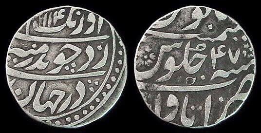 The coins of Aurangzeb bore his name and title ‘Abu-al-zafar Muiuddin Muhammad Bahadur Shah Alamgir Aurangzeb Badshah Ghazi’ on the obverse side of the coin during the early years of his ruling period. Later he introduced a couplet which was composed by Mir Abdul Baqi Shahbai. The couplet came into use at different dates at different mints. Except from Akbarabad, the couplet was used by all mints and continued till the end of reign. The couplet was adopted by Akbarabad very late. The square area like Shah Jahan’s coins was used during the early years at Akbarabad and Junagarh. Aurangzeb introduced a separate formula, which carried ‘Sanh julus Manus zarb‘ with the name of the mint. The connotation of this phrase was “struck at (mint’s name) in the year (regnal year) of the accession associated with prosperity.”