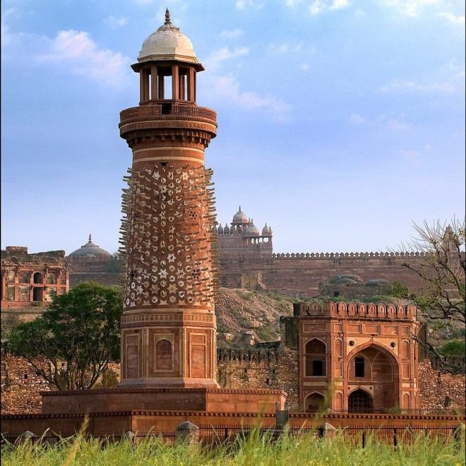It stands (as an akashdiya) just in front of the main entrance of the fort. A miniature from the manuscript of the Akbarnama preserved at Victoria and Albert Museum [“Akbar’s victorious return to Fatehpur Sikri”, outline by Kesav the Elder, painting Nar Singh, opaque watercolour and gold on paper, Mughal, ca. 1590-95, IS.2:110-1896] testifies that this indeed was the entrance gate the palace beyond which the Hiran Minar can be seen!